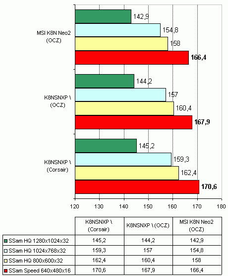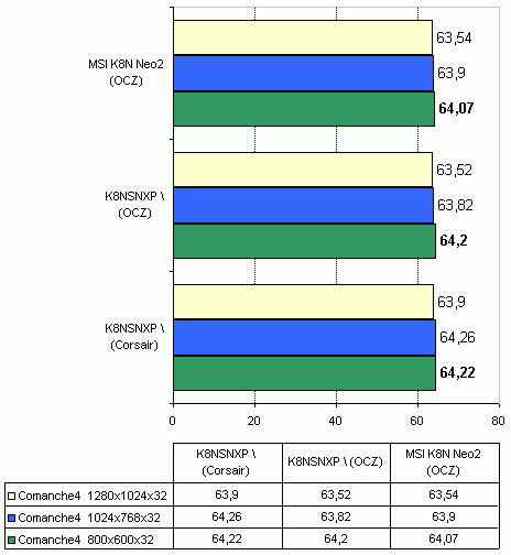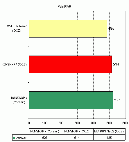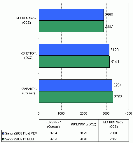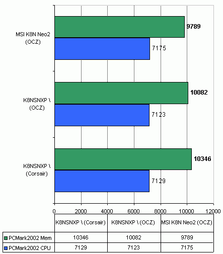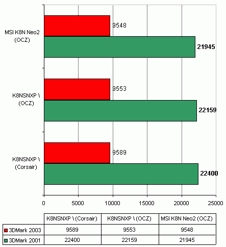 Что касается совместимости с модулями памяти, то тут плате похвастаться нечем. Во-первых MSI K8N Neo2 отказалась стартовать с двумя модулями Corsair TwinX PC3200 в двухканальном режиме. Согласно тестовому отчету с сайта MSI, плата может работать с такими модулями либо в одноканальном режиме, либо в двухканальном но только с четырьмя модулями. Во-вторых плата отказалась изменить штатную частоту памяти Kingston HyperX PC2700 на 200Мгерц (что соответствует DDR400). Кстати, плата Gigabyte K8NSNXP-939 на этом же чипсете, не имеет такой проблемы.