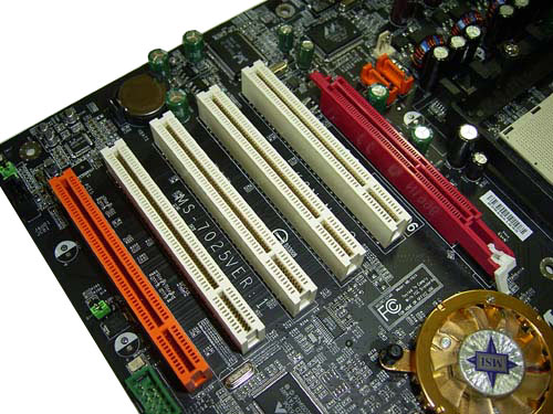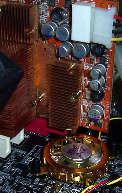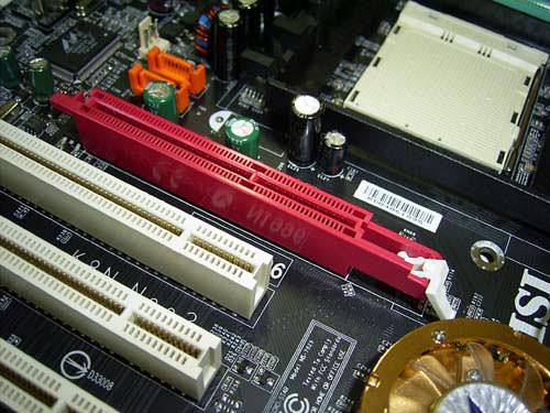 Причем защелка имеет традиционную конструкцию, что вкупе с близко расположенным кулером на чипсете создает проблемы с определенными моделями видеокарт. Пример - снять установленную видеокарту Asus Radeon9800XT очень трудно.