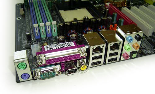 А вот для поддержки последовательной шины USB2.0, были задействованы возможности чипсета nForce3 Ultra. В результате плата поддерживает 8 портов, четыре из которых расположены на задней панели, а еще четыре подключаются с помощью брекетов (в комплекте один брекет с двумя портами).