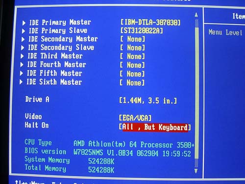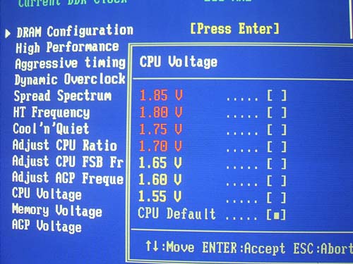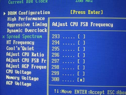 Выбор осуществляется весьма неудобно: приходится прокручивать все промежуточные значения. Причем прокрутка работает довольно медленно, в отличии от плат Asus (пример Asus A8V Deluxe).