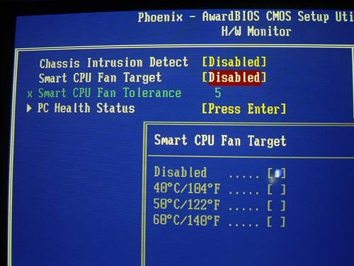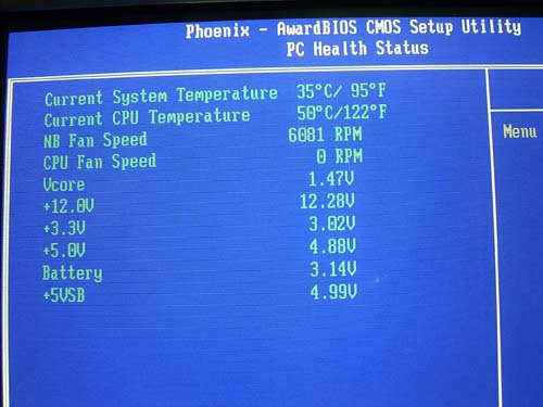 Перед нами стандартный набор параметров: уровни напряжений, текущая температура процессора и системы, а также скорости вращения двух вентиляторов, которые могут быть подключены к плате. Кстати скорость процессорного кулера может быть привязана к температуре CPU, с помощью функции Smart FAN.