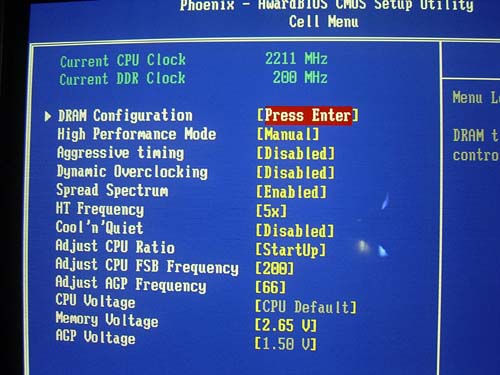 Настройки памяти (находятся в разделе "Cell Menu") нельзя назвать богатыми: только основные параметры, включая "2T Timing" (о нем мы подробно рассказывали в обзоре чипсета VIA K8T800 Pro).