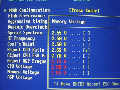 Диапазон изменения от 1.50V до 1.85V с шагом 0.05V. Таких функций как изменение напряжения на чипсете и шине Hypertransport у платы K8N Neo2 нет.