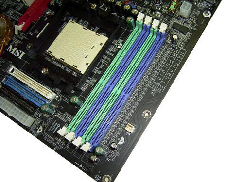 Поскольку контроллер памяти процессора Athlon64 Socket939 поддерживает двухканальный доступ, слоты памяти разбиты на две группы. В каждой группе один слот относится к одному каналу памяти, другой слот - к другому. То есть, что бы задействовать двухканальный доступ нужно установить минимум два модуля в соседние слоты разного цвета. Таким образом организация слотов памяти на платах с чипсетом nForce3 Ultra отличается от плат на чипсете VIA K8T800 Pro.