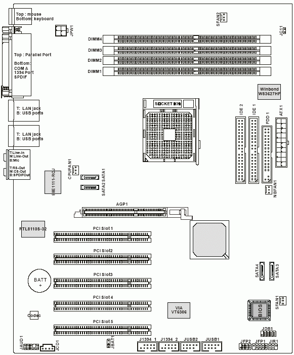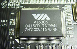 Это чип VT6306 производства компании VIA (кстати из соображений политкорректности этот чип был заклеен бумажкой.) В результате плата поддерживает три порта IEEE1394, один из которых находится на задней панели, а два других реализованы с помощью брекета (нет в комплекте).