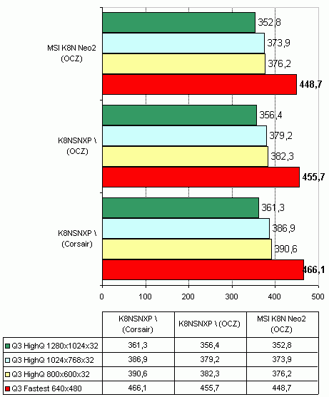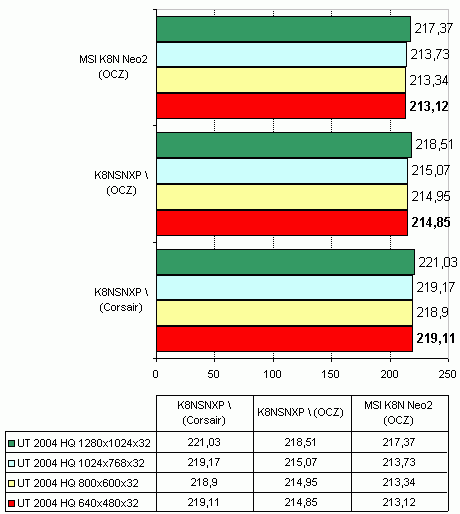 Что касается использования памяти OCZ PC3200, то никаких проблем мы не обнаружили. Поэтому тесты производительности мы проводили именно с этой памятью (хотя ее тайминги нельзя назвать низкими). И наконец при использовании памяти Geil PC4400 - мы не обнаружили никаких проблем. Более того, память подобного типа (DDR500 и выше) можно смело рекомендовать для разгона Socket939-систем. Если при разгоне с использованием DDR400 памяти нам приходилось использовать понижающие делители частоты памяти, то с памятью DDR500 мы используем наиболее производительный синхронный режим (впрочем насколько он быстрее - мы рассмотрим в следующих материалах).