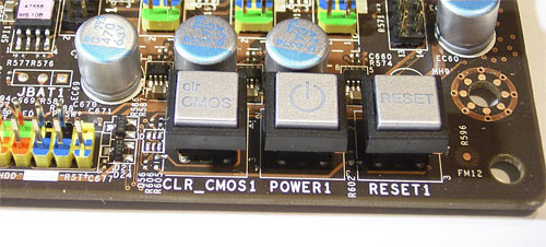 Отметим некоторые особенности компоновки. Во-первых, на плате установлены три кнопки для сброса настроек CMOS, запуска системы и перезагрузки.
