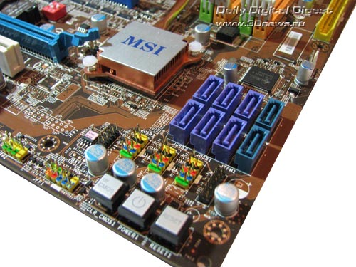 На плате MSI P45 Neo2 установлен "южный мост" ICH10R, с радиатором. В результате, плата поддерживает шесть портов SerialATA II (коннекторы синего цвета) и позволяет объединить диски в RAID-массивы уровня 0, 1, 5 и 10.