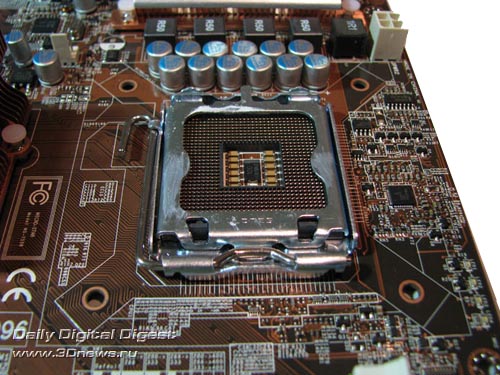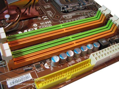 Под "северным мостом" установлено четыре 240-контактных слота DIMM для модулей памяти DDR2. Они разбиты на две группы по два слота: первая пара относится к первому каналу контроллера, вторая - ко второму каналу.