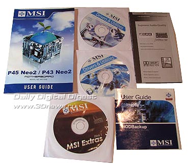 Два диска содержат драйверы и фирменные утилиты для операционных систем XP и Vista. Третий диск называется MSI Extras и содержит дополнительное ПО для оболочки UEFI. Эта оболочка является неким аналогом среды ASUS Express Gate Lite, но в настоящий момент плата MSI P45 Neo2 ее не поддерживает. Более подробно о технологии UEFI можно узнать на этой странице.