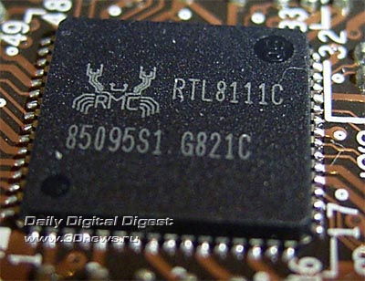 Далее - на плате установлено 12 портов USB 2.0. Из них шесть портов установлены на задней панели, а еще шесть подключаются при помощи планок (нет в комплекте). Дизайн PCB предусматривает установку двухпортового контроллера последовательной шины - IEEE1394 ("FireWire"), но на нашей плате он не распаян. Плата MSI P45 Neo2 имеет встроенный восьмиканальный звук Intel High Definition Audio, а в качестве кодека используется чип ALC888. Теперь несколько слов о сети: на плате установлена пара высокоскоростных контроллеров RTL8111C производства Realtek (Gigabit Ethernet).
