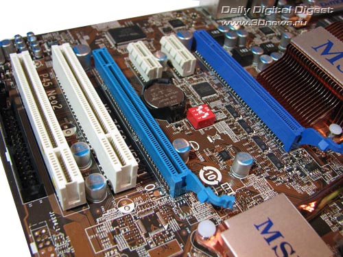 Отметим, что на первый слот всегда выделяется 16 линий шины. При установке второй видеокарты распределение линий осуществляется по схеме 8+8. Таким способом плата поддерживает технологию AMD/ATI Crossfire. Кроме перечисленных слотов, на плате MSI P45 Neo2 установлено еще два "обычных" PCI-слота, а также два слота PCI Express x1.