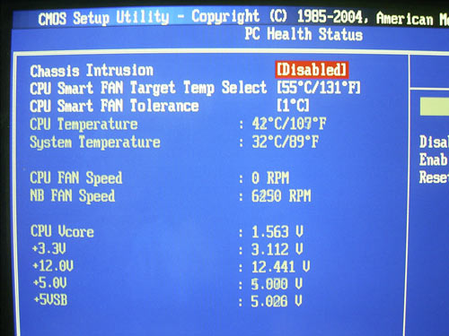 Плата отслеживает текущую температуру процессора и системы, скорости вращения двух вентиляторов и текущие значения напряжений. Кроме того, скорость процессорного кулера может быть привязана к температуре CPU, с помощью функции Smart FAN.