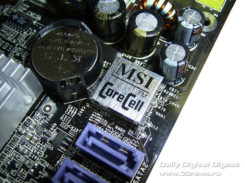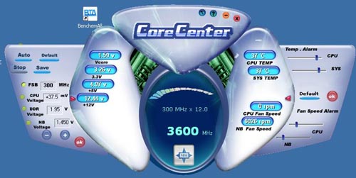 Во-вторых, на плате установлен блок CoreCell, который предназначен для выполнения таких задач как динамический оверклокинг, системный мониторинг, управление питанием и управление скоростью вращения вентиляторов. При этом он тесно взаимодействует с утилитой CoreCenter, которая позволяет пользователю управлять перечисленными функциями.