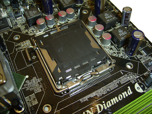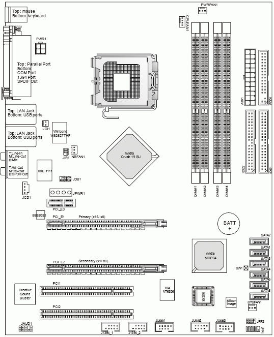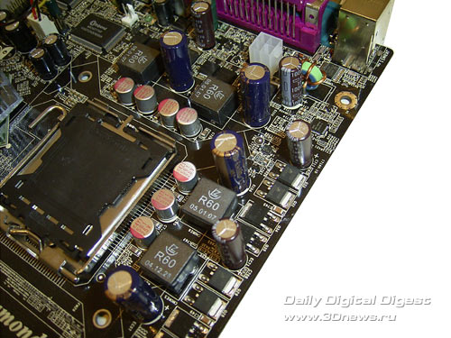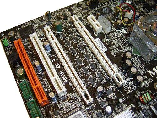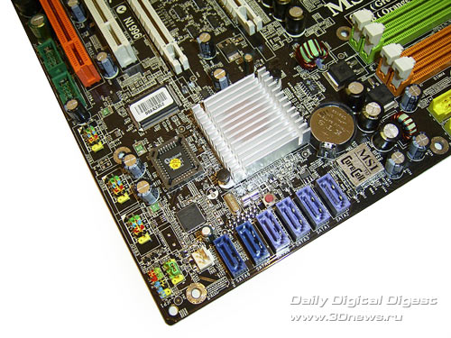 В целом дизайн платы вполне традиционный и особых хлопот у сборщика не вызовет. Основной и дополнительный разъемы установлены удобно - по краям платы. А вот разъем питания Molex установлен около северного моста, и кабель питания подключать несколько неудобно. Впрочем, этот разъем нужно задействовать только при установке пары очень мощных видеокарт (типа 6800 Ultra).