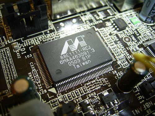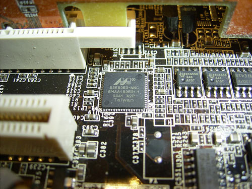 Далее - на плате установлено 2 гигабитных сетевых контроллера. Первый - это чип 88E1111 производства компании Marvell (подключен к шине PCI):