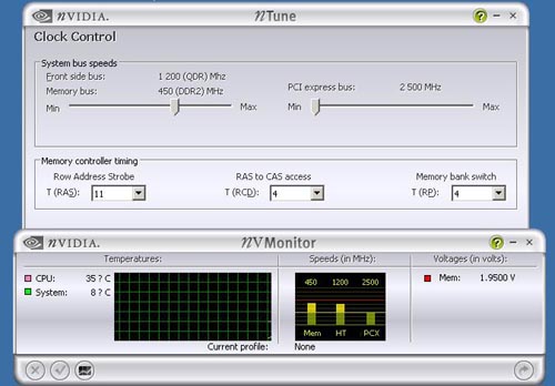 Продолжая тему программного разгона отметим, что фирменная утилита nVidia nTune (версия 2.05.09) опознала чипсет, и вполне стабильно работала на нашей плате. В частности работала функция изменения частоты FSB, частоты памяти и таймингов памяти. Однако некоторые другие функции программы, как например nTune Monitor, работали не совсем корректно: