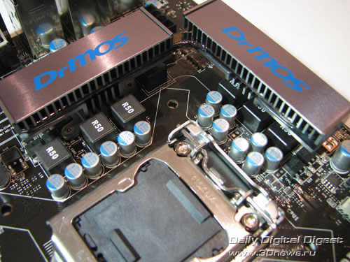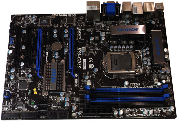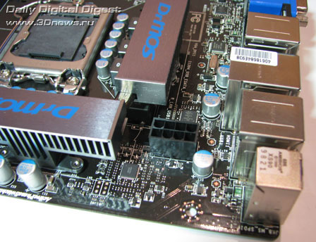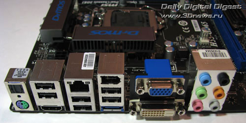 Отметим, что на плате присутствуют следующие видеовыходы: VGA, DVI и HDMI (отсутствует только DisplayPort). Однако еще раз подчеркнем, что для их использования необходим один из новых процессоров Intel со встроенным графическим ядром.