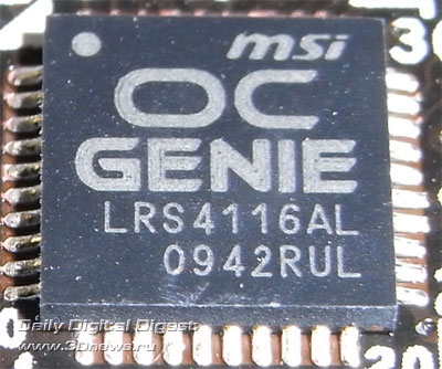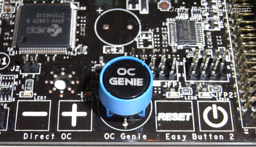 Дизайн печатной платы предусматривает установку блока из пяти кнопок. Две из них стандартные: одна предназначена для старта система, другая для перезапуска. Третья кнопка называется OC Genie, и предназначена для запуска одноименной функции разгона. Еще пара кнопок предназначены для увеличения и уменьшения базовой частоты Bclk. Однако на модели MSI H55-GD65 установлена только одна кнопка - OC Genie.