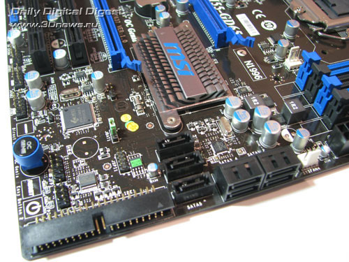 Благодаря чипсету Intel H55 плата поддерживает шесть портов SerialATA II и позволяет объединить диски в RAID массивы уровня 0, 1, 5 и 10. Соответствующие порты окрашены в черный цвет и расположены около чипсета.