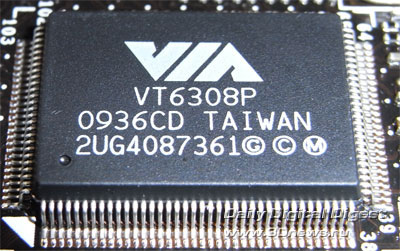На плате установлено 12 портов USB2.0: шесть расположены на задней панели, а еще шесть подключаются при помощи планок (нет в комплекте). Плата поддерживает и другой вид последовательной шины - IEEE1394 ("FireWire"). Для этого на плату установлен контроллер VT6308P производства VIA. В результате плата поддерживает два порта FireWire: один расположен на задней панели, другой подключается с помощью планки (нет в комплекте).