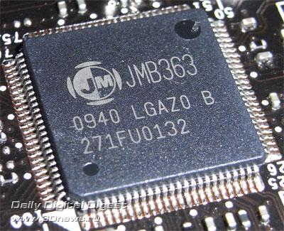 Кроме этого на плате установлен дополнительный SATA/PATA/RAID контроллер JMB363, который обеспечивает поддержку двух каналов SerialATA II и одного канала ParallelATA. Причем один из портов SATA расположен около чипсета, а другой выведен на заднюю панель платы. В результате общее количество подключенных дисков равно 10 (8 SATA + 2 PATA).