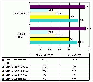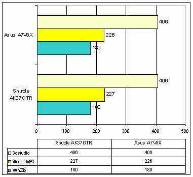 ![]() ![]() Далее - результаты тестов офисных приложений. ![]() И, наконец, игровые приложения. ![]() ![]() ![]() ![]() Плата несколько уступает в производительности плате Asus A7V8X, а следовательно и большинству плат на KT333. ВыводыПо сравнению с предыдущей моделью (AK35) мы видим значительное усиление функций разгона. Остальные параметры платы изменились незначительно: исчез один PCI слот, зато появилась поддержка SerialATA, USB 2.0 и встроенная сеть. Некоторые проблемы остались нерешенными, в частности отсутствие поддержки встроенного термодатчика процессора Athlon X.P. И, наконец, стоит вспомнить о 4 слотах DIMM и 3 разъемах питания, которые выделяют плату Shuttle AK37GTR из ряда себе подобных. Итак, плата выглядит прекрасно, но эту радужную картину портит VIA со своим KT400, который по производительности уступает KT333. Впрочем, нужно помнить, что в играх с высоким разрешением (начиная с 1024х768) большую роль играет мощность видеокарты и показатели плат на KT400 и KT333 практически выравниваются. Так или иначе, AK37GTR представляет собой отличный продукт для требовательного пользователя. ЗаключениеПлюсы: