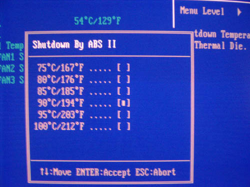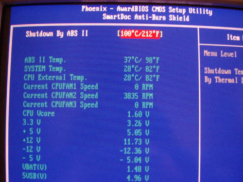 Кроме этого пользователю доступна информация о скорости вращения всех трех вентиляторов; есть показания всех напряжений (в том числе и напряжения на батарейке). Также можно задать значение критической температуры ядра процессора (ABS II), при достижении которой система выключится. Доступные значения : 75град.C - 100град.C с шагом 5 градусов C.