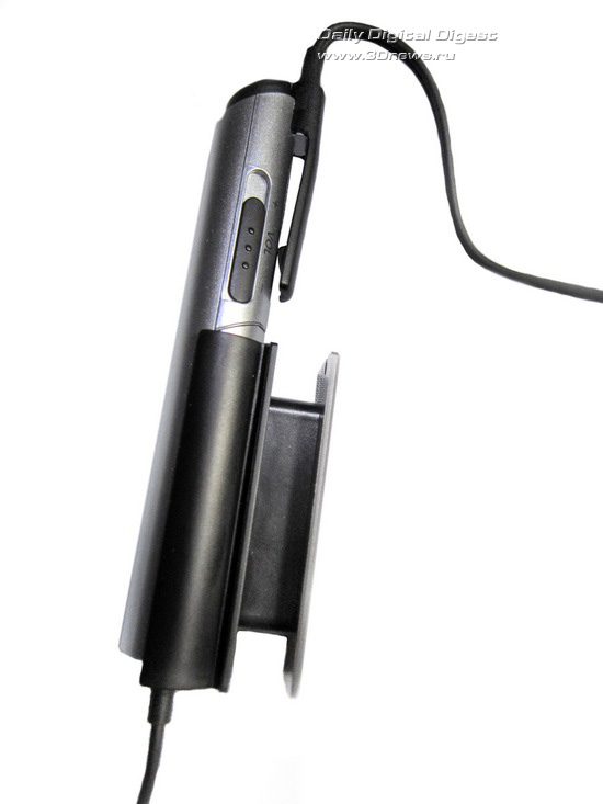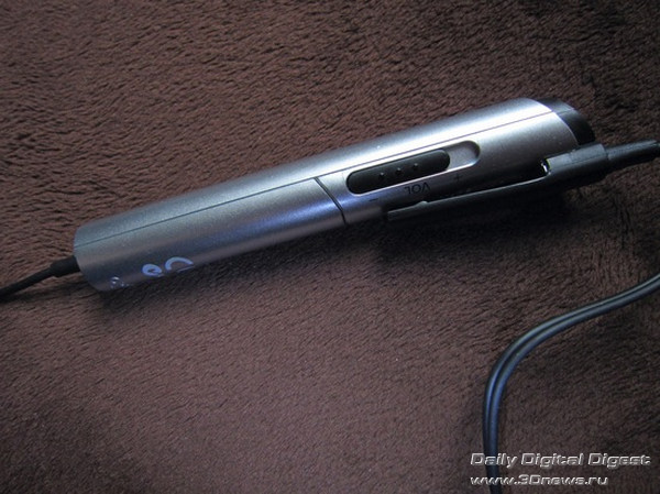 На корпусе пульта имеется специальный ползунок — регулятор громкости. На обратной стороне ДУ расположена клипса для фиксации в кармане или на другой части одежды. Как уже было сказано выше, к пульту можно пристегнуть пластмассовый держатель и намотать на него лишний провод.
