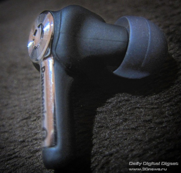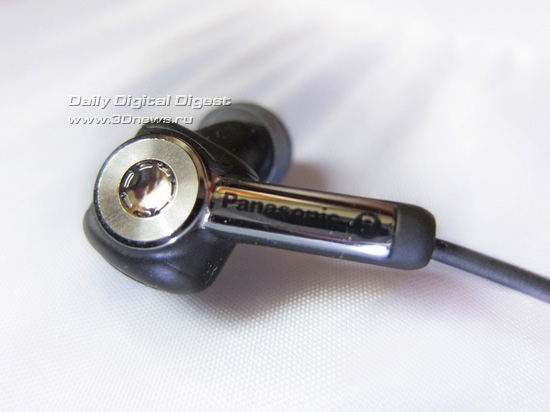В итоге «пробки» получились относительно большого размера — это не такая уже и редкость, но в основном крупные модели, которые можно найти в продаже, вытянуты в направлении провода, что позволяет получить устойчивое положение в ухе. Здесь же ситуация совершенно иная: увеличен размер головки наушника, она стала «раздутой». Конструкторы сыграли на смещении центра тяжести вставного наушника, RP-HC55 одевается не только путем вставки силиконового уплотнителя в ушной канал, но и еще «кладется» на выступ ушной раковины.