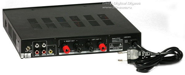 Наряду с разъёмом для подключения наушников, на лицевой панели есть ещё и гнездо для подключения, например, гитары. Впрочем, заядлым гитаристам обольщаться не стоит. Кроме уровня входящего сигнала усилитель позволяет изменить лишь уровень эха, для которого на лицевой панели тоже имеется своя ручка регулировки. Ну и пару слов стоит сказать о встроенном MP3-плеере, органы управления которым на лицевой панели вынесены в отдельный блок. Здесь есть USB-разъём для подключения носителя с MP3-файлами и три маленькие кнопки управления проигрыванием с коротким и очень тугим ходом. Пользоваться ими не слишком удобно, поэтому стоит пожелать разработчикам оснастить новые версии усилителя хотя бы самым простым миниатюрным ИК-пультом для управления плеером. Ну а в самом правом углу лицевой панели расположена кнопка подключения режима MP3-проигрывателя.