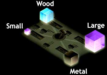 Все управление выносится на специальный манипулятор, который в рамках устройства называется «stick controller», а для дальнейшей простоты изложения мы используем понятие «джойстик». Данный манипулятор изменяет свое положение в 2D-плоскости, управляя изменением величин двух параметров. Их максимальные и минимальные (или крайние) значения соответствуют противоположным углам по диагонали. На приведенном рисунке показан пример одновременно управления материалом (дерево/металл) и размером (малый/большой). Причем, для «scape» и «sphere» любой модели предусмотрено по три пары (три уровня) таких параметров, каждой из которых возможно управлять отдельно.