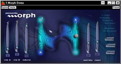 В частности, Prosoniq Morph — в одном из своих интервью Стефан Бернси отметил, что данный программный модуль предназначен для тех пользователей, которые не могут себе позволить такой «мерседес» как Neuron для того, чтобы добраться из пункта А в пункт Б. В рамках этого плагина предоставлятся возможность смешивания двух сигналов, по типу того, как это делается в блендере NEURON. Конечно, все в очень упрощенном виде, но есть программный 2D-контроллер, позволяющий регулировать взаимоотношение образов и форм. Prosoniq Morph может быть интересен и еще по одной причине — дело в том, что данный плагин достаточно мало «весит» для системы, и в любой серьезной программе, поддерживающей VST, можно делать многослойные инструменты и мощный эффект-процессинг в 5.1 и больше, подключив сразу несколько Prosoniq Morph.