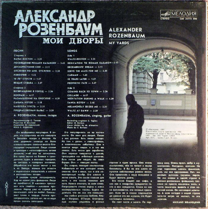 1.4. Александр Розенбаум, «Вальс-бостон». Альбом «Мои дворы», 1986 год. Russian Zapyl Co. ![]() Автор по ряду причин не рассказывает историю создания и записи этой песни. Однако уже на восемнадцатой секунде ваше сознание должно ненадолго померкнуть, и вы почти незаметно для себя войдете в образ огромного нечесанного пса, бредущего по улице провинциального советского города в начале восьмидесятых годов прошлого века. Вы будете видеть улицу глазами пса, причем картинка обязательно должна быть черно-белой. Пройдя до перекрестка, вы увидите газету, гонимую порывом ветра. Вы должны успеть прочитать заголовок о награждении Ленинского района Саранска орденом Дружбы, после чего очнуться. Данный визуальный ряд – единственно верный, тогда как остальные возникающие образы вроде ощущения себя щенком в зоомагазине говорят о некачественном звуке или, к сожалению, несовершенствах вашего психо-акустического аппарата. Комментирует профессор Ковалев: «Визуальные галлюцинации – очень неустойчивое состояние, и потому тест с треком «Вальс-бостон» среди психиатров-аудиофилов считается очень опасным. Если вы не уверены в крепости нервов или обладаете плохой наследственностью, можно послушать «Казачью» того же автора, где вы ненадолго, всего на три-четыре секунды, ощутите себя конем».