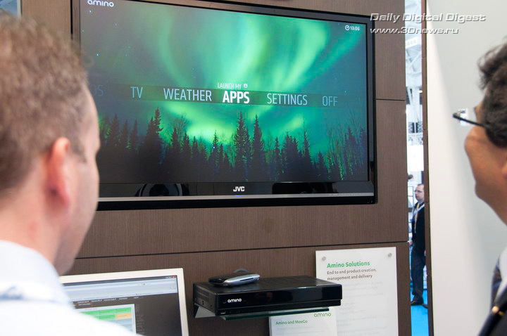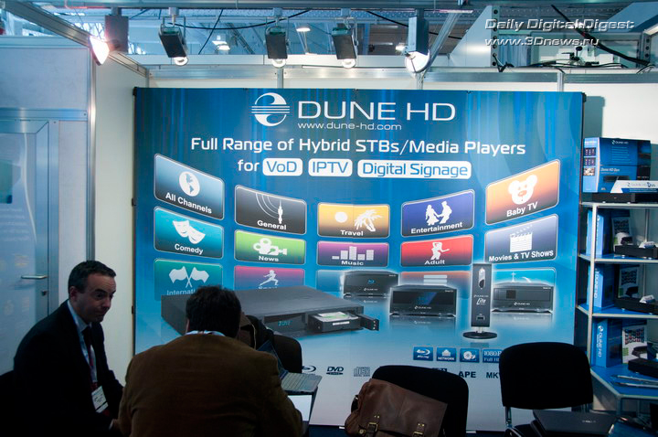 Парни из российской компании Dune HD продемонстрировали, как их приставка на чипе Sigma принимает по IPTV трехмерное кино. Врать не буду, много посмотреть не удалось, но недавно вышедший фильм «Алиса в Стране чудес», признанный в Голландии документальным, выглядел крайне убедительно. Мгновенная доступность контента в FullHD и 3D, да в сочетании с простотой управления, да без привязки к одному поставщику каналов… Это ли не телевидение, которое будет приятно смотреть даже нынешним телененавистникам?