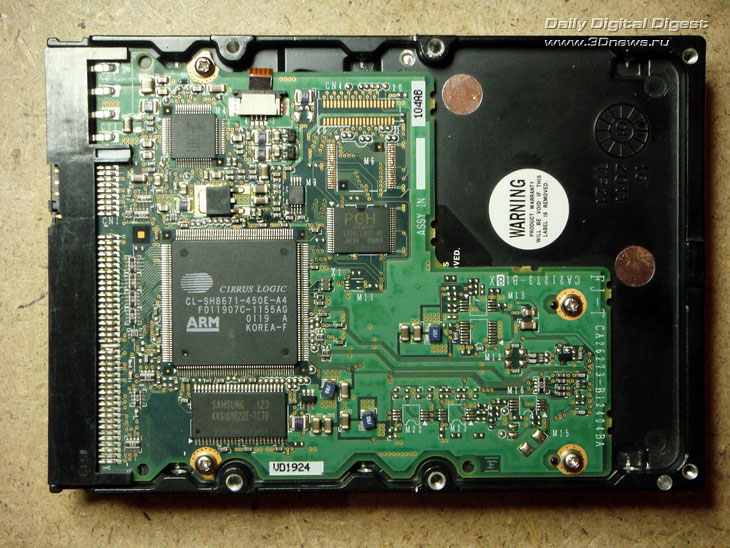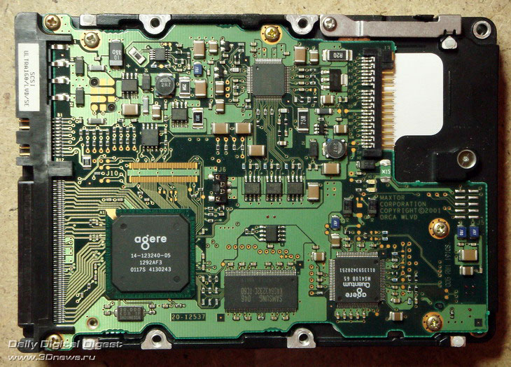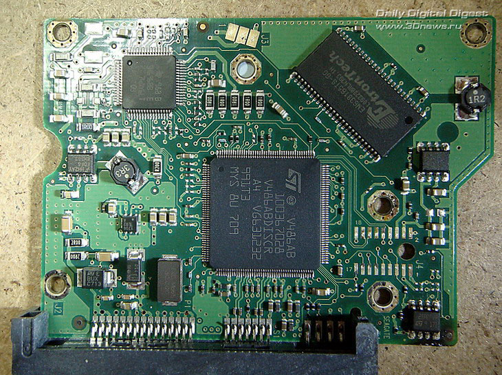 А это, для контраста, плата современного диска с интерфейсом SCSI. В подобных изделиях на электронике не экономят: прибыль с серверного сегмента и так неплохая, можно заявлять пятилетнюю гарантию