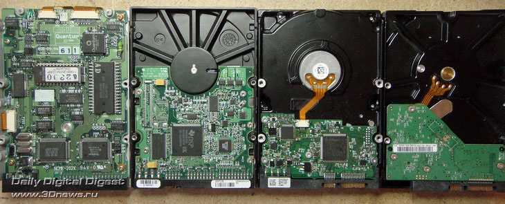 Слева направо: диски 1993, 2002, 2007 и 2010 г.в. Электронная плата постоянно сокращалась в размерах, а число деталей на ней уменьшалось. Все это — во имя экономии: при жестокой конкуренции по-другому не выжить. Увы, но к концу 2011 года число производителей HDD, похоже, сократится до минимума
