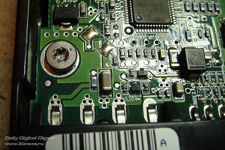 Окисленные контактные площадки (справа внизу) на плате диска Seagate 7200.10, который больше года пролежал на складе. Если бы диск не стал донором головок, плата явно бы нуждалась в чистке