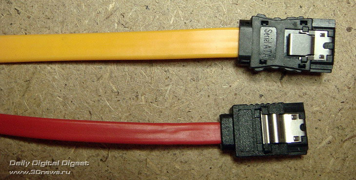 На многих дисках предыдущего поколения, в том числе и активно используемых (2008 г.в.), разъем SATA не имеет выступа под защелку, отчего шлейфы новой версии садятся на него слабо и не фиксируются — защелка не срабатывает. Сползти наконечник может от чего угодно — хоть от вибрации дисковой корзины, хоть от упругости свернутого в спираль шлейфа. Понятно, что это резко снижает надежность подключения и потому недопустимо. Здесь подойдет только «старый» шлейф без защелок с его тугой посадкой (вариант фиксации соединения термоклеем — на жаргоне «соплями» — я не рассматриваю, хотя у сборщиков он довольно популярен). Кстати, ремонтники в своих стендах используют шлейфы именно первой версии, как наиболее универсальные (да и возиться с защелками порой времени нет).
