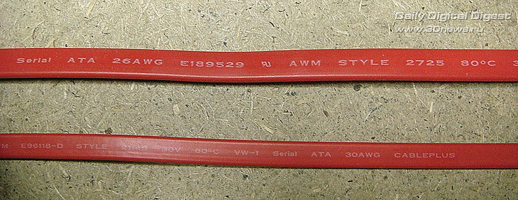 Кроме длины, плоские шлейфы SATA различаются еще и по толщине. Она колеблется от 5 до 10 мм, что связано с сечением токопроводящих жил (от 30AWG до 26AWG — маркировка калибра обычно присутствует на кабеле), а также с плотностью экранирующей оплетки (ее занижение — любимый трюк китайцев, экономящих медь всеми способами). Разумеется, стоит всегда использовать наиболее толстый кабель — это повышает уровень сигнала и снижает наводки от помех. На тонком длинном шлейфе иной диск может и не опознаться либо будет работать с перебоями — виной тому малая нагрузочная способность интерфейсных микросхем.