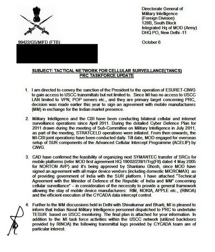 В частности, в данном документе, датированном октябрем 2011 года, говорится, что «ранее в текущем году было принято решение о подписании соглашения с изготовителями устройств мобильной связи — в обмен на гарантии их присутствия на индийском рынке». Согласно тексту меморандума, это соглашение было подписано со всеми основными мировыми производителями, а также с местной компанией-поставщиком Micromax. Соответственно, разведывательное подразделение CYCADA ныне занимается перехватом данных от сетей мобильной связи, опираясь на технологии бэкдоров, добровольно предоставленных корпорациями RIM, Nokia и Apple (RINOA). Попутно в тексте упомянуто и программное обеспечение корпорации Symantec — как своего рода опорная платформа для обеспечения мониторинга данных, передаваемых в сетях мобильной связи...