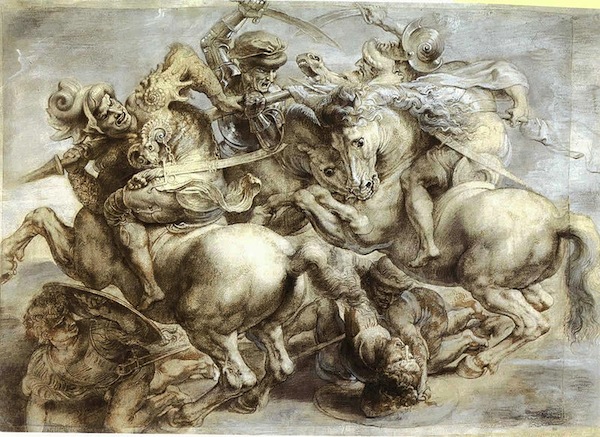 «...Он изобразил группу всадников, бьющихся из-за знамени, — вещь, признанная превосходнейшей и в высокой степени мастерской из-за удивительнейших замыслов, воплощенных при изображении этого смятения. Ярость, ненависть и мстительность у людей в нем выражена столь же ярко, сколь у лошадей... Невозможно передать, какими разнообразными нарисовал Леонардо одежды солдат, их шлемы и другие украшения, не говоря уже о невероятном мастерстве, явленном в контурах лошадей, крепость мускулов которых и красоту стати Леонардо умел передавать лучше, нежели кто-либо».