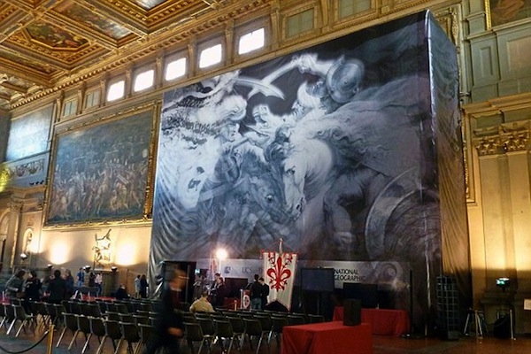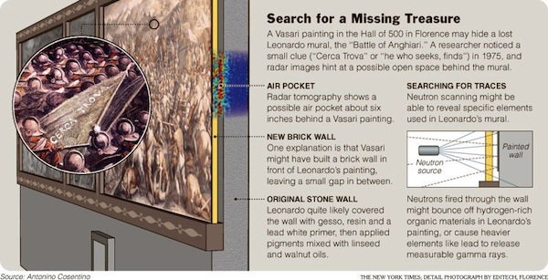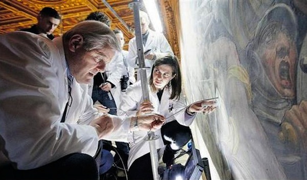 Объясняя суть проделанной ими работы, ученые во главе с профессором Маурицио Серачини (Maurizio Seracini) рассказали следующее. Благодаря применению миниатюрных щупов и видеозондов, их исследовательский хайтек-проект позволил обнаружить убедительные свидетельства того, что знаменитая фреска Леонардо да Винчи, утраченная еще пять веков тому назад, вероятно, все еще существует — за скрывающей ее фальшстеной непосредственно в том самом зале, где проходит пресс-конференция.