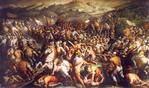 Леонардо же, что известно с документальной достоверностью, не только выставил в зале большой картон с наброском, но и приступил непосредственно к росписи «Битвы при Ангиари» 6 июня 1505 года, когда ему было 53 года. Фреска должна была запечатлеть в веках выдающуюся победу Флоренции над войсками Милана летом 1440 года, когда, несмотря на свое численное превосходство, миланцы были разгромлены небольшим флорентийским отрядом.