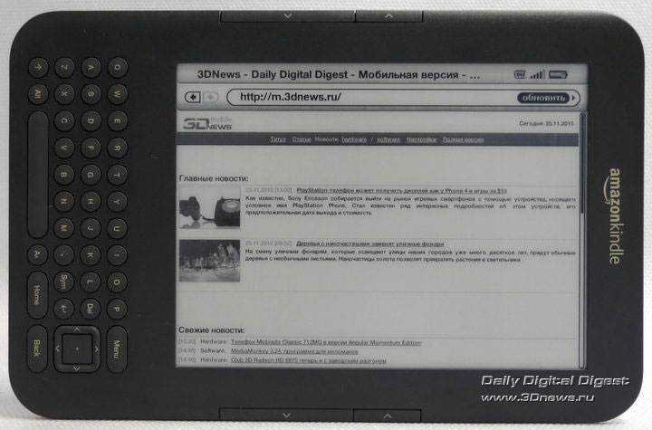 Каждый раз перед Новым годом мы начинаем ломать голову на предмет подарков хорошим людям, чтобы было оригинально, полезно, красиво и укладывалось в бюджет. Мы уже успели обменяться на фоне елки мобильными телефонами, mp3-плеерами и цифровыми «мыльницами», а теперь, похоже, пришло время читалок. Цены на них еще не достигли заветной стодолларовой отметки, но это не мешает электронным книгам уверенно теснить бумажные в руках пассажиров московского метрополитена. Думается, причина тут не только в желании приобщиться к прогрессу, но и в банальной экономии, ведь цены традиционных книг достигли вполне нью-йоркского уровня, в отличие от зарплат и пенсий читающих россиян. Интересно, что в метро e-book очень часто читают граждане среднего и даже пожилого возраста, а значит, ваши мама или дедушка, скорее всего, освоят новый гаджет быстрее мобильника. 3DNews регулярно рассказывает о новых электронных «читалках», и, как правило, речь идет о моделях, поставляемых в Россию официально и доступных в крупных торговых сетях. Сегодня же мы поговорим о продукте, за считанные месяцы завоевавшем огромную популярность в мире, но к нам пробирающемся понемножку, окольными путями да козьими тропами. Конечно же, речь идет об электронной книге Amazon Kindle, а точнее – о третьем ее поколении, поступившем в продажу летом этого года. ![]() Известный интернет-магазин Amazon экспериментирует с электронными книгами с ноября 2007-го, и с каждым годом они становятся все функциональнее, тоньше и дешевле. Так, если за первую инкарнацию Kindle жителям США предлагали заплатить $399 без учета налогов (в другие страны она вообще не поставлялась), то за новые версии просят от $139 (Wi-Fi) до $189 (Wi-Fi+3G). Несмотря на гуманную цену, язык не повернется назвать Kindle представителем серого племени «бюджетников»: в продаваемых сегодня читалках используется экран производства Epson на основе второго поколения E-Ink, которое еще называют Pearl. Такие есть только в новых Kindle и топовых моделях читалок Sony. Сама Amazon говорит о 50-процентном улучшении контрастности экрана по сравнению с Kindle 2, хотя недавно казалось, что лучше-то и быть не может. Как и в предыдущих версиях, экран не сенсорный, и многим из нас, привыкшим к чувствительным дисплеям даже на стиральных машинах, это может показаться недостатком. На самом же деле из-за отсутствия регулярных прикосновений рабочая поверхность не покрывается отпечатками пальцев, а для листания предусмотрены удобнейшие аппаратные кнопки, продублированные для правшей и левшей. Для ввода текста есть аппаратная же QWERTY-клавиатура. Последняя, правда, снабжена только латинскими буквами, но об устранении этой дисгармонии мы поговорим чуть ниже. ![]() Комплект поставки Kindle в соревнованиях по аскетизму побеждает даже продукцию Apple. Фактически в коробке, кроме самого устройства, лежит только очень краткая инструкция, стандартный кабель с разъемом micro-USB и миниатюрное зарядное устройство, причем коробка и инструкция явно сделаны из переработанной бумаги. Более того, в английской версии Kindle отсутствует даже зарядник: видимо, в Amazon не стали придумывать новую упаковку ради внушительных габаритов стандартной британской электровилки и решили просто ее не класть. Список поддерживаемых форматов электронных книг и документов довольно велик (AZW, PDF, TXT, MOBI, PRC, HTML, DOC, RTF), но, как видим, не включает популярные в 