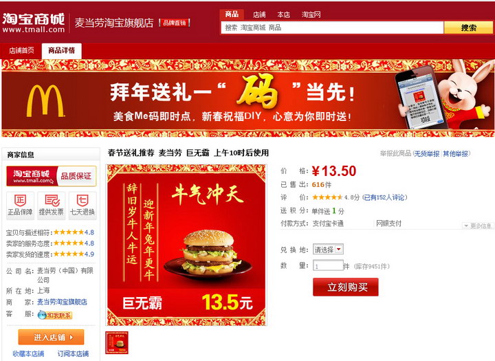Заказом через Taobao.com пиццы или гамбургеров крупных сетевых ресторанов быстрого питания не удивишь давно — фактически это аналог телефонного звонка, только быстрее и с оплатой банковской карточкой. Но интернет-торговля стала настолько привлекательной, что через Taobao.com уже торгуют производители еды и рестораны из всех регионов Китая. Онлайн-продажи легких закусок, сладостей и десертов в 2010 году выросли в 7 раз, а в новом году объем всех категорий пищевых продуктов, проданных через Интернет, должен увеличиться на порядок. Такой прогноз выглядит совершенно реальным, ведь купить через Taobao.com можно уже не только полуфабрикаты, как раньше, но и полноценные готовые блюда из ресторанов. Они помещаются в вакуумную упаковку (обретая способность без добавления консервантов оставаться свежими до недели), и все, что требуется от покупателя, — просто разогреть еду.