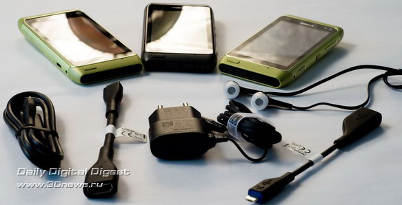 Комплект поставки нового смартфона обещает быть довольно богатым. Кроме зарядного устройства, дата-кабеля и наушников (к слову, довольно приличных), в коробке обнаружатся переходник HDMI и чудо-шнур USB, через который к N8 можно подключить любой накопитель, поддерживающий стандарт USB Mass Storage. Последнее, по задумке разработчиков, облегчает копирование на N8 разнообразных медиафайлов, но, уверен, у наших читателей уже мелькнула мысль об установке на смартфон торрент-клиента, который будет сохранять файлы на подключенном внешнем жестком диске. Не знаю, обеспечивает ли разъем достаточное для HDD-питание, но флэшку он тянет точно. И нет никаких сомнений, что такой не очень полезный, но ужасно забавный функционал будет очень скоро реализован кем-то из небольших разработчиков.