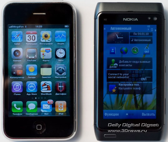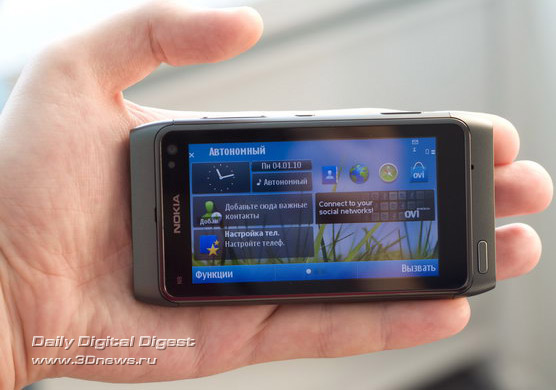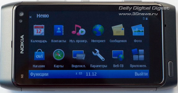 Интерфейс Nokia N8 уже сейчас работает очень шустро, рабочие столы листаются мгновенно, равно как и обложки альбомов в плеере. За скорость отвечает дополнительный графический чип, включенный постоянно, а не только в 3D-приложениях. Поинтересовался – не будет ли следствием такой быстроты стремительное же сжирание аккумулятора, и получил заверения в том, что волноваться нет причин. За звук тоже отвечает дискретный чип, и, говорят, результаты он выдает достойные. Правда, убедиться в этом самому почему-то не предложили. Равно как не разрешили и сделать несколько снимков на восхваляемую 12-мегапиксельную камеру.