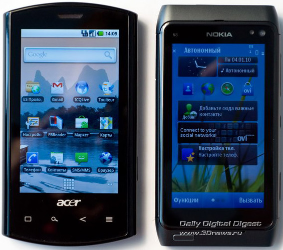 Размеры и изображение экрана Nokia N8 по сравнению с iPhone 3GS, Acer Liquid E и Nokia n900 (сверху вниз)
