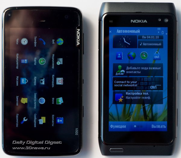 Внешне прототипы Nokia N8 выглядят весьма убедительно и, учитывая, что в железе никаких изменений не планируется, разочарований по этому пункту покупателям ждать не стоит. Металлический корпус, приятно тяжелящий руку, выглядит очень добротно, а небольшой горб 12-мегапиксельной камеры на тыльной части (его пришлось добавить из-за конденсатора ксеноновой вспышки) ничуть не портит общую картину. 3.5-дюймовый экран с разрешением 640х360 также выглядит неплохо, хотя на лицевой панели он занимает несколько меньше места, чем это принято у конкурентов. Создается ощущение, что сначала планировали поставить 3.7-дюймовую матрицу, но в последний момент что-то переиграли, и теперь о планах напоминает лишь широкая черная кайма со всех сторон, особенно заметная снизу. По официальным данным, экран в N8 выполнен по технологии AMOLED, однако Евгений Лукьянчиков особо уточнил, что присутствует зеркальная подложка, облегчающая использование смартфона на ярком солнце. Уточнение вызвало некоторое недоумение: ведь невозможность установки такой подложки является одним из главных недостатков AMOLED-матриц, и обойти это ограничение пока никому не удавалось. Samsung, главный поставщик мобильных AMOLED-экранов, попытался ликвидировать проблему в технологии Super AMOLED за счет уменьшения зазоров между слоями экрана, однако ни о какой подложке речь все равно не идет. Поневоле начинаешь верить в слухи о Super TFT LCD производства Sony в финальной версии N8.